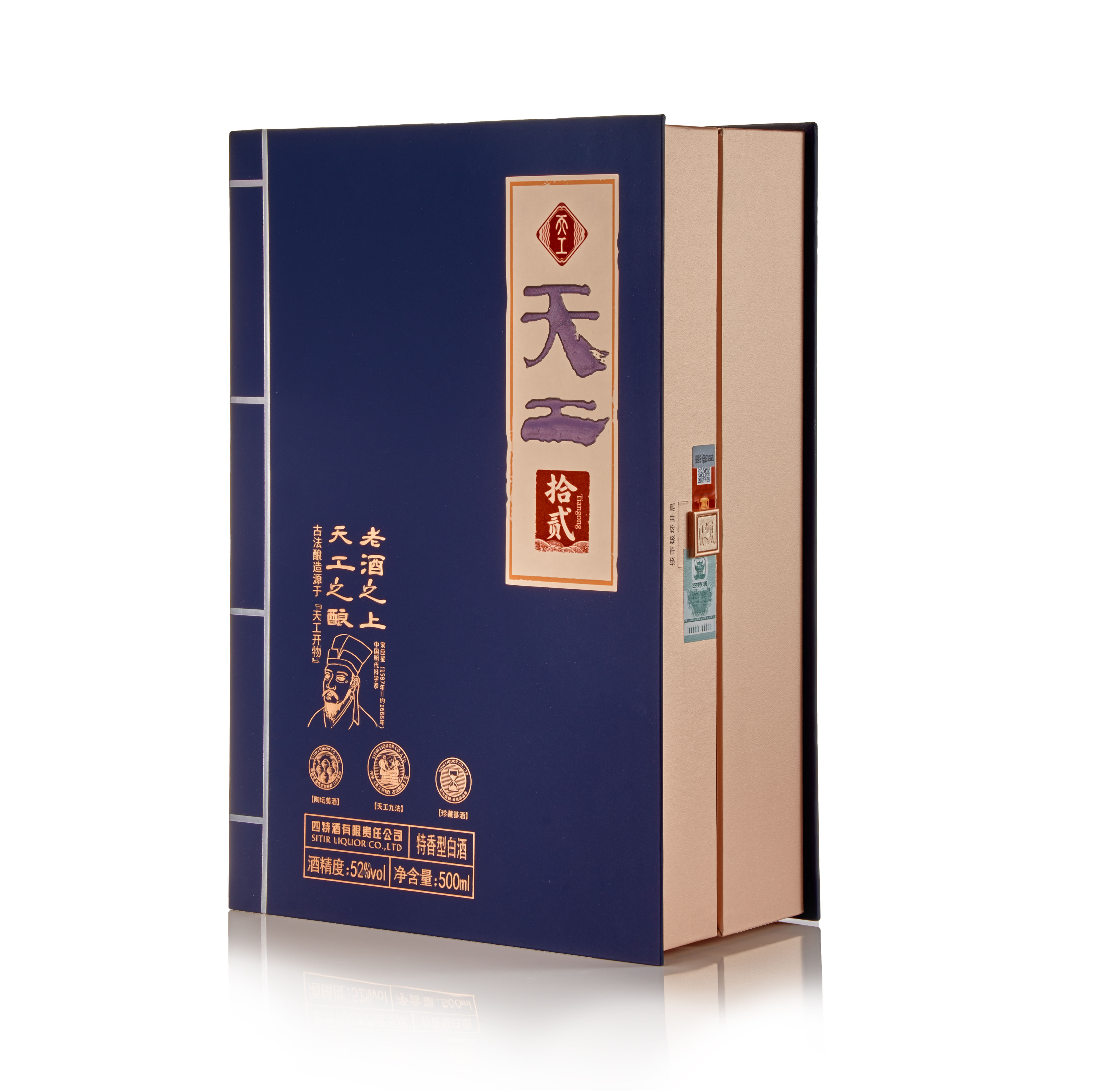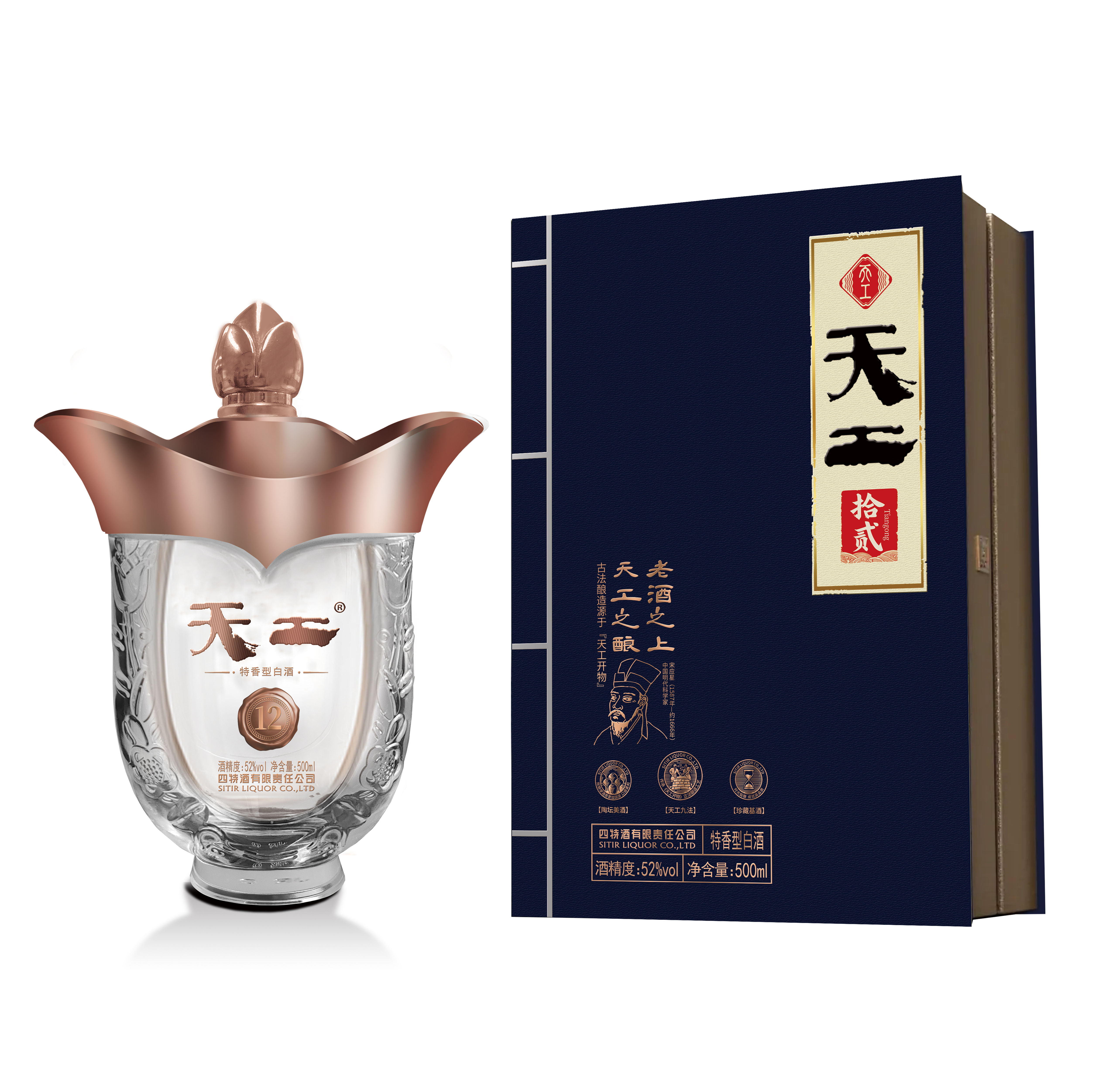 天工·拾貳,以古籍《天工開物》為設(shè)計(jì)靈感,既蘊(yùn)含復(fù)古韻味又富有文化內(nèi)涵,凝聚工匠之心及古人智慧于一體的高端年份佳釀。經(jīng)典玉蘭花器型,傳遞君子氣韻,配以玫瑰金色披肩,寓意“金蘭之交”的至誠情誼,古靛青主色調(diào),深藏“青出于藍(lán)”哲思,顯大家風(fēng)范。酒體色澤微黃透明,聞香典雅舒適,入口綿甜甘潤,醇厚細(xì)膩、香味諧調(diào)、回甜凈爽、余味悠長、特香風(fēng)格典型。